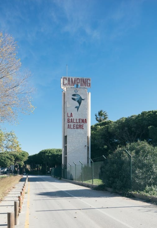 La Ballena Alegre was the most innovative design-driven and bauhaus-ass campground in the world when it opened in 1965. Famed photographer Francesc Català Roca came to shoot snaps of the cutting-edge minimalist structures of the cafeteria and the communal showers. The logo of the happy whale was a well-known sight for those heading south along the coastal highway.